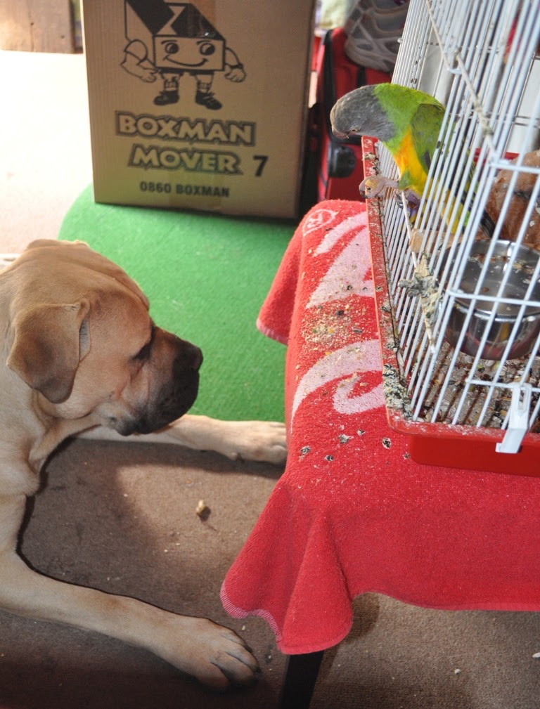 Below is a picture of Mufaza, Box Man and Bubbles in his make shift pozzy (slang for 'home'). It makes sense to me that Bubbles needs to find new ways to amuse himself, seeing as he doesn't have his large 'villa' (cage) with all his usual comforts and toys. Mufasa seems to suffice.